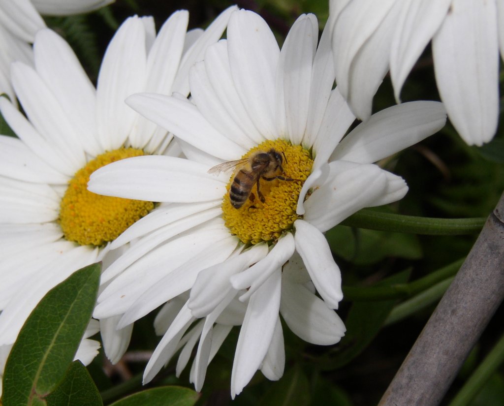 of a marguerite. Honeybees belong to the insect order Hymenoptera