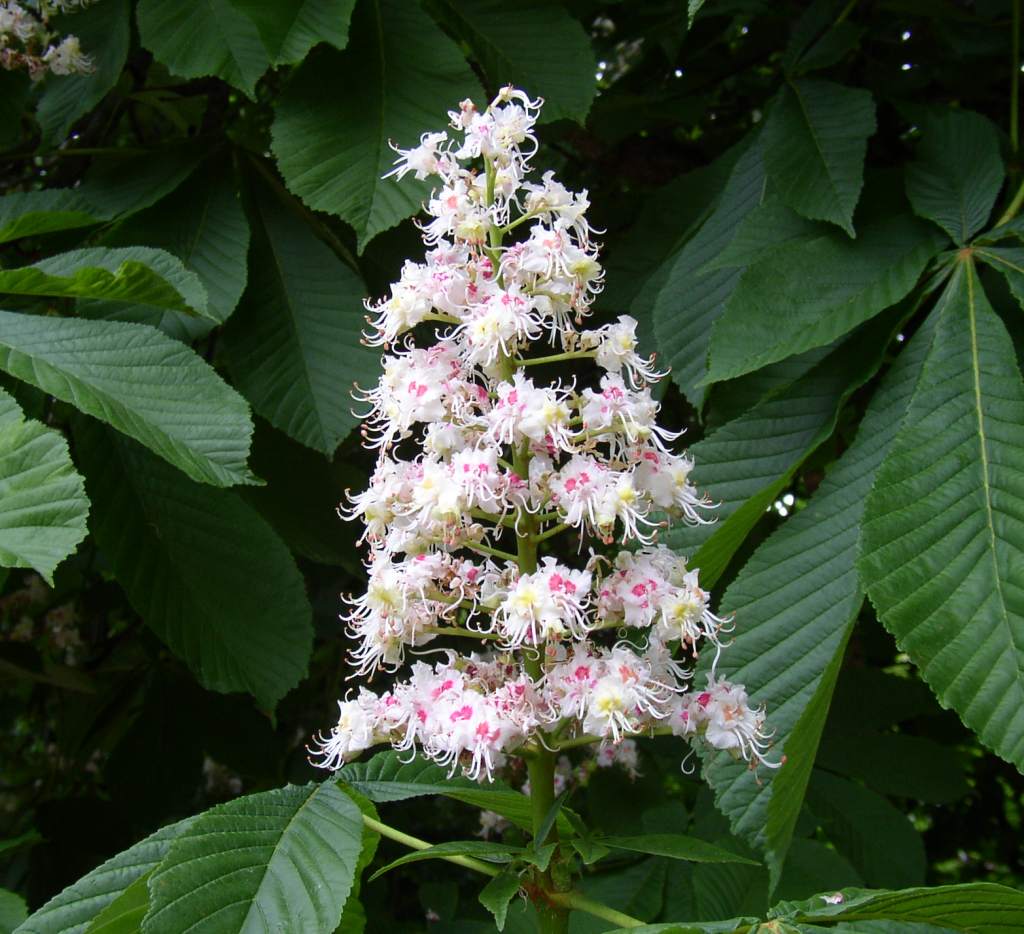 Here is a spike of flowers from a Horse Chestnut. The long curved stamens and style in each flower can clearly be seen. A well grown "conker" tree covered in these large creamy flower spikes is a sight to behold.