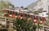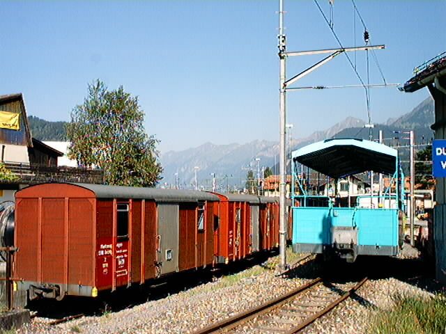 wagons in a Swiss siding. Notice the overhead electric cable above the blue vehicle. |